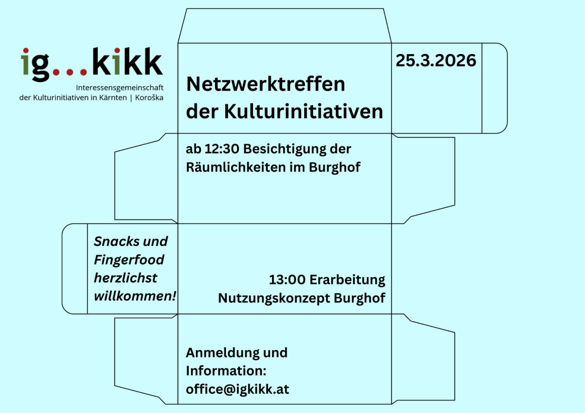 Die IG KiKK lädt alle Kulturinitiativen, Kulturaktive und Interessierten aus ganz Kärnten/Koroška zum nächsten spartenübergreifenden Netzwerktreffen ein. Am Mittwoch, 25. März 2026, ab 12:30 Uhr, geht es im Burghof Klagenfurt um ein gemeinsames Nutzungskonzept für die Räumlichkeiten, die vom Land Kärnten für die freie Szene zur Verfügung gestellt werden sollen.