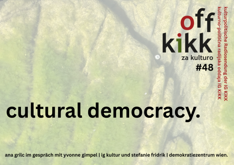 KiKK OFF – za kulturo #48 – Eine Frage der Cultural Democracy Das Konzept der „Cultural Democracy“ verhandelt Fragen rund um die Zugänglichkeit kultureller Angebote, den gerechten Zugang zu kulturellen Ressourcen und Fördermitteln sowie die Verbindung von politischer und kultureller Partizipation. Gemeinsam mit den Redakteurinnen der neuen Schwerpunktausgabe des IG Kultur-Magazins, Yvonne Gimpel und Stefanie Fridrik, erörtert KIKK OFF za kulturo das Konzept der „cultural democracy“ und seine praktische Dimension innerhalb und außerhalb Österreichs.